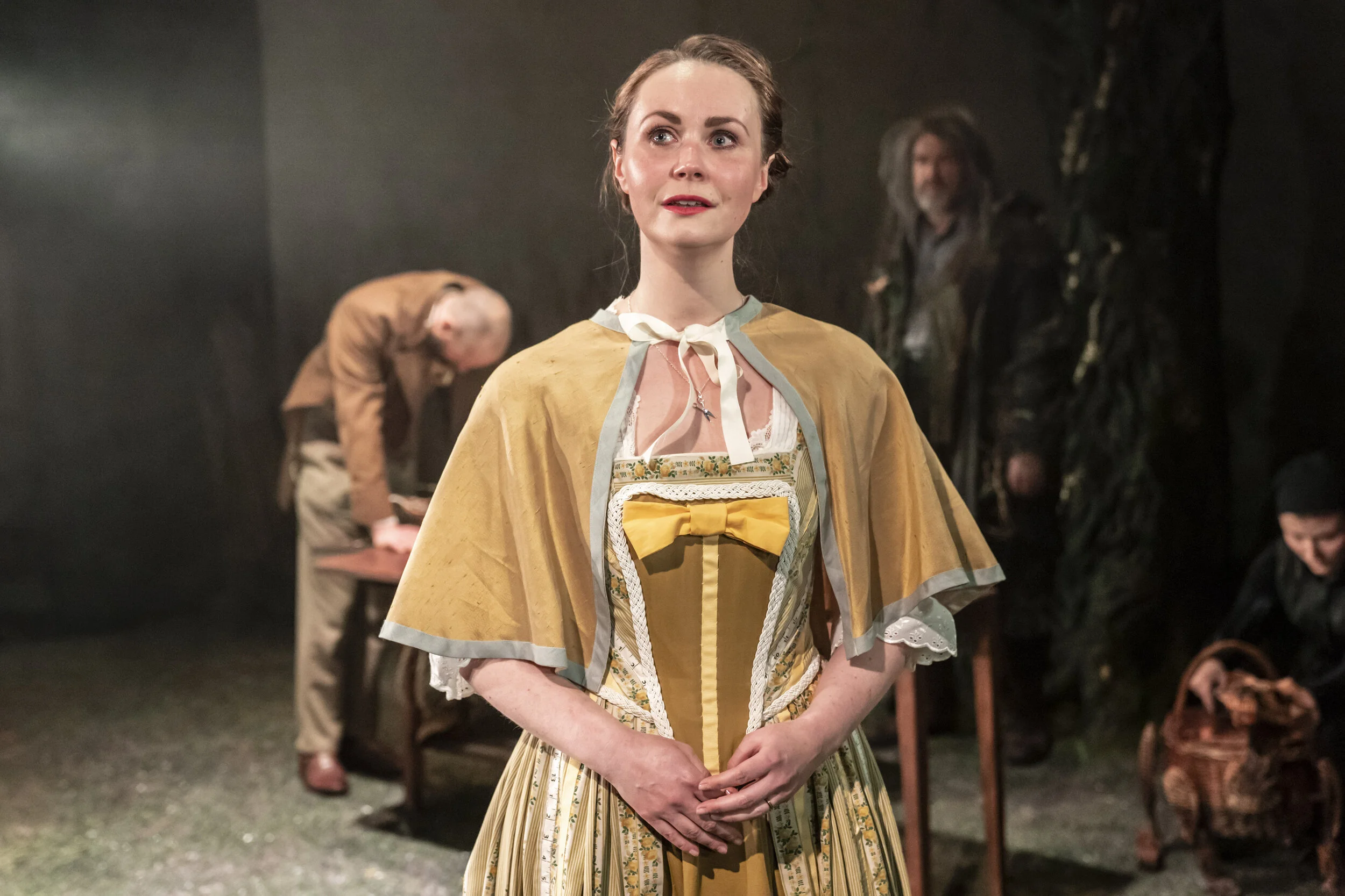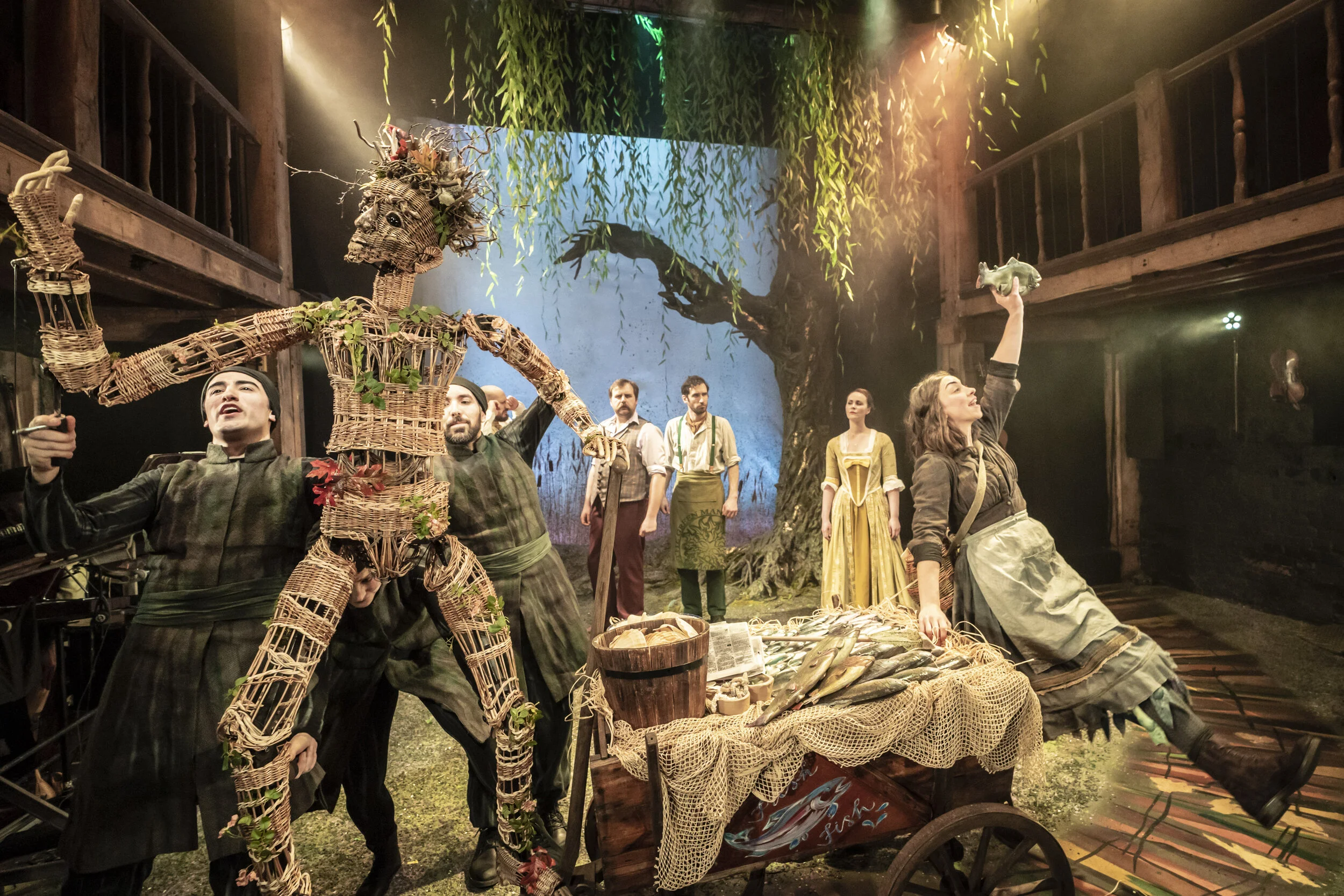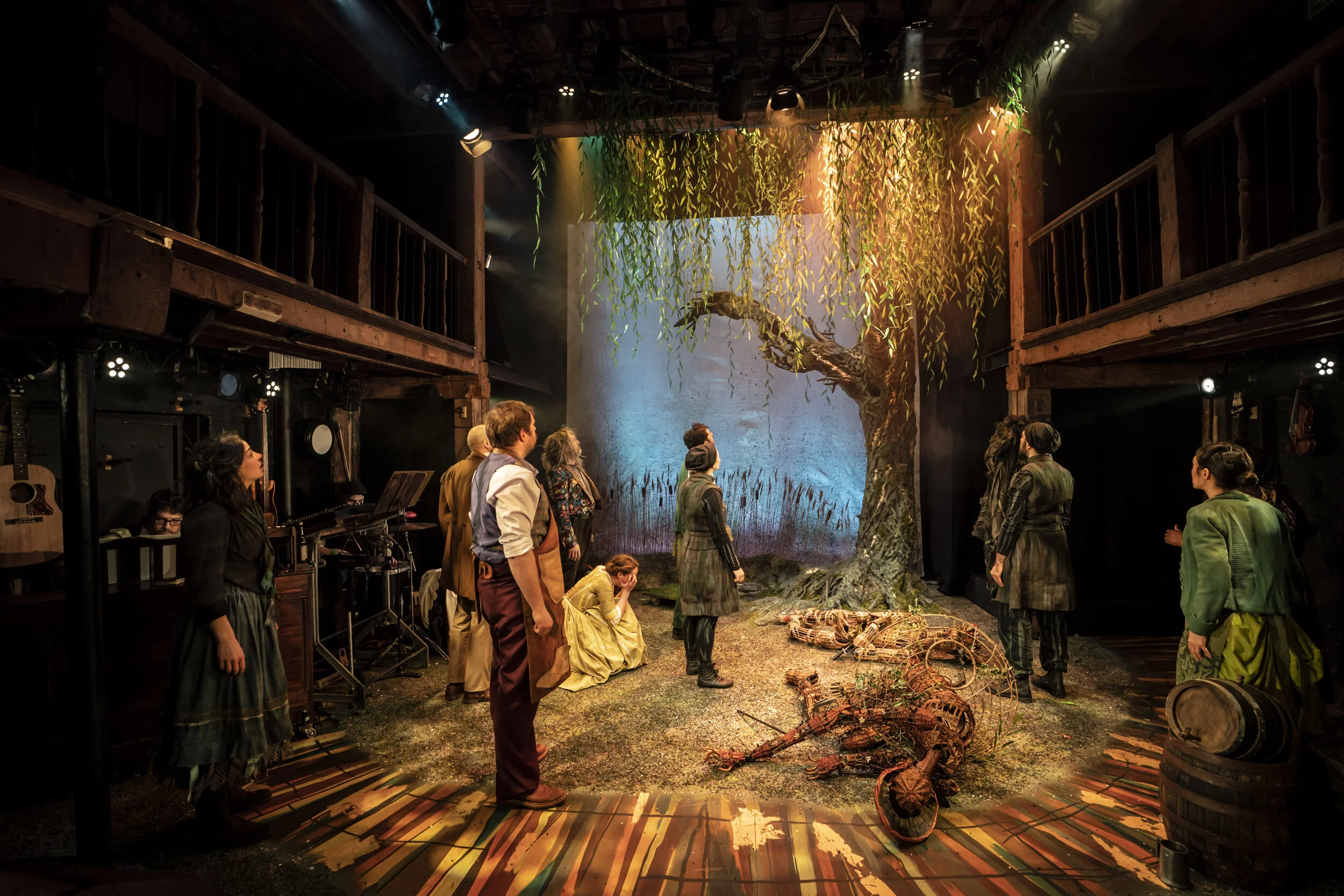 'Designer Anna Kelsey has turned the intimate Watermill Theatre space inside out. Her willow tree bends over sun-kissed waters fringed with bulrushes, to a soundscape of birdsong by sound designer Ella Wahlström that mimics the beauty of the natural world outside the venue itself’.